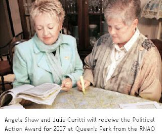 Angela Shaw and Julie Curitti will receive the Political Action Award for 2007 from the Registered Nurses Association of Ontario (RNAO), at Queen's Park on January 24th.