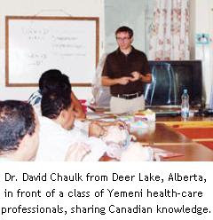 "........Patients move from the acupuncture beds to a chair where a Tui Na massage completes their treatment. The traditional Chinese massage is done with bare hands -- "with healing, touch is so important"The second is Dr. David Chaulk, a pediatrician from Alberta, who teaches Yemeni health care professionals the advanced knowledge from Canada and to help them catch-up.